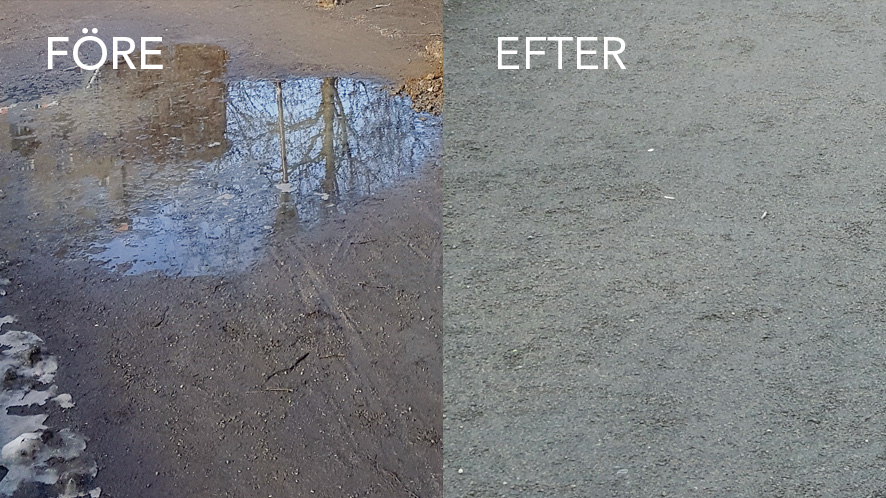 När stenmjölsytor blir mättade av regn packas de allt tätare, vilket gör att de snabbt tappar både bärighet och dräneringsförmåga. Grusytor med Hekla Grusgång blir torrare och mer stabila, detta tack vare pimpstenens höga porositet som gör att vattnet dräneras betydligt snabbare.